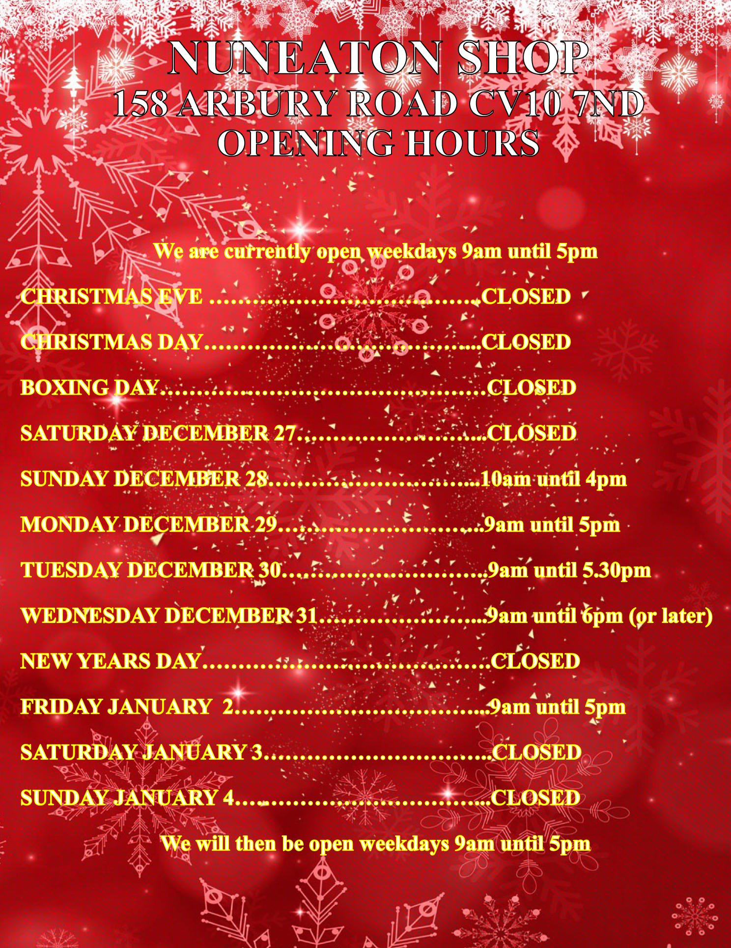 NUNEATON SHOP OPENING TIMES